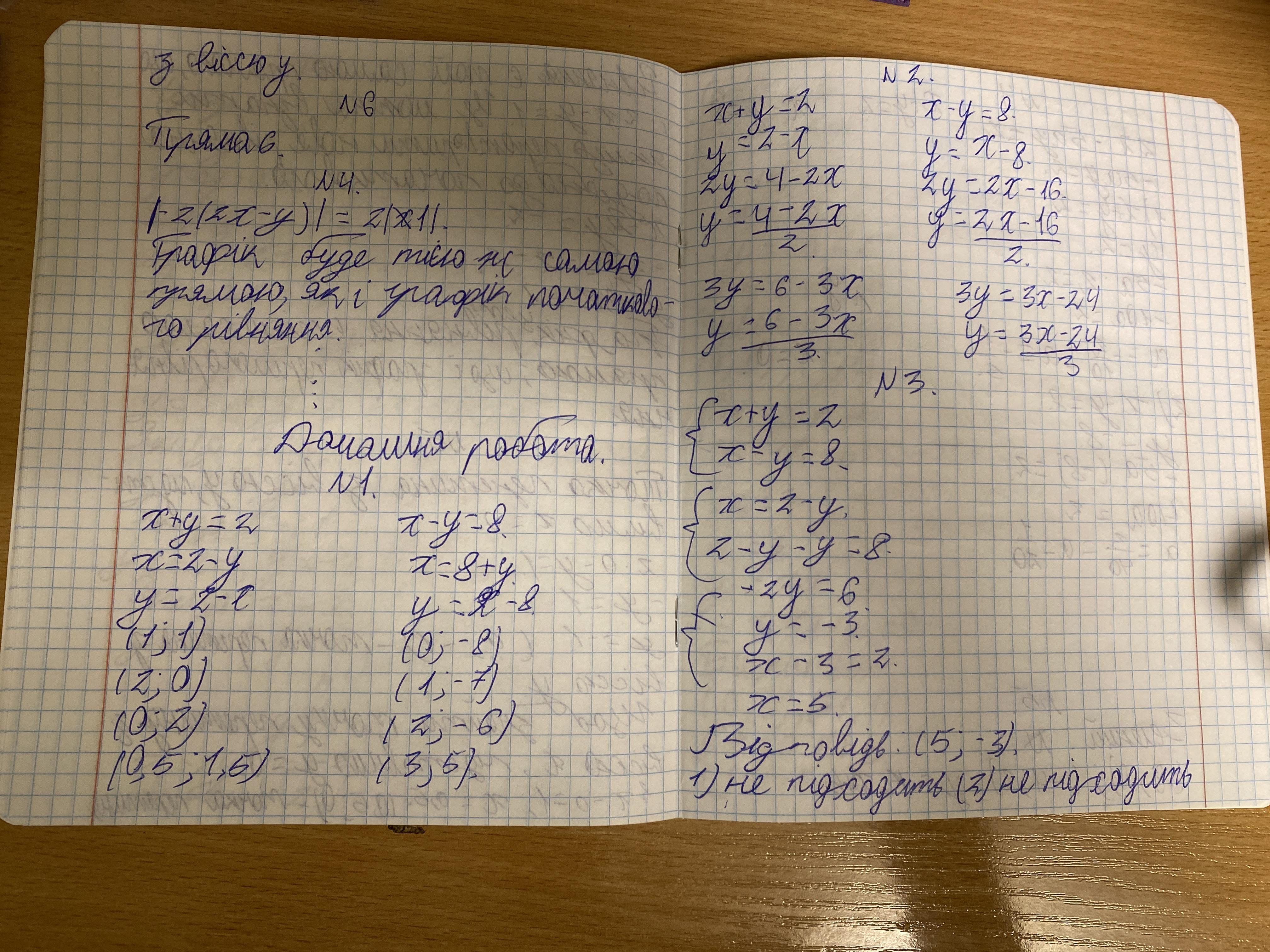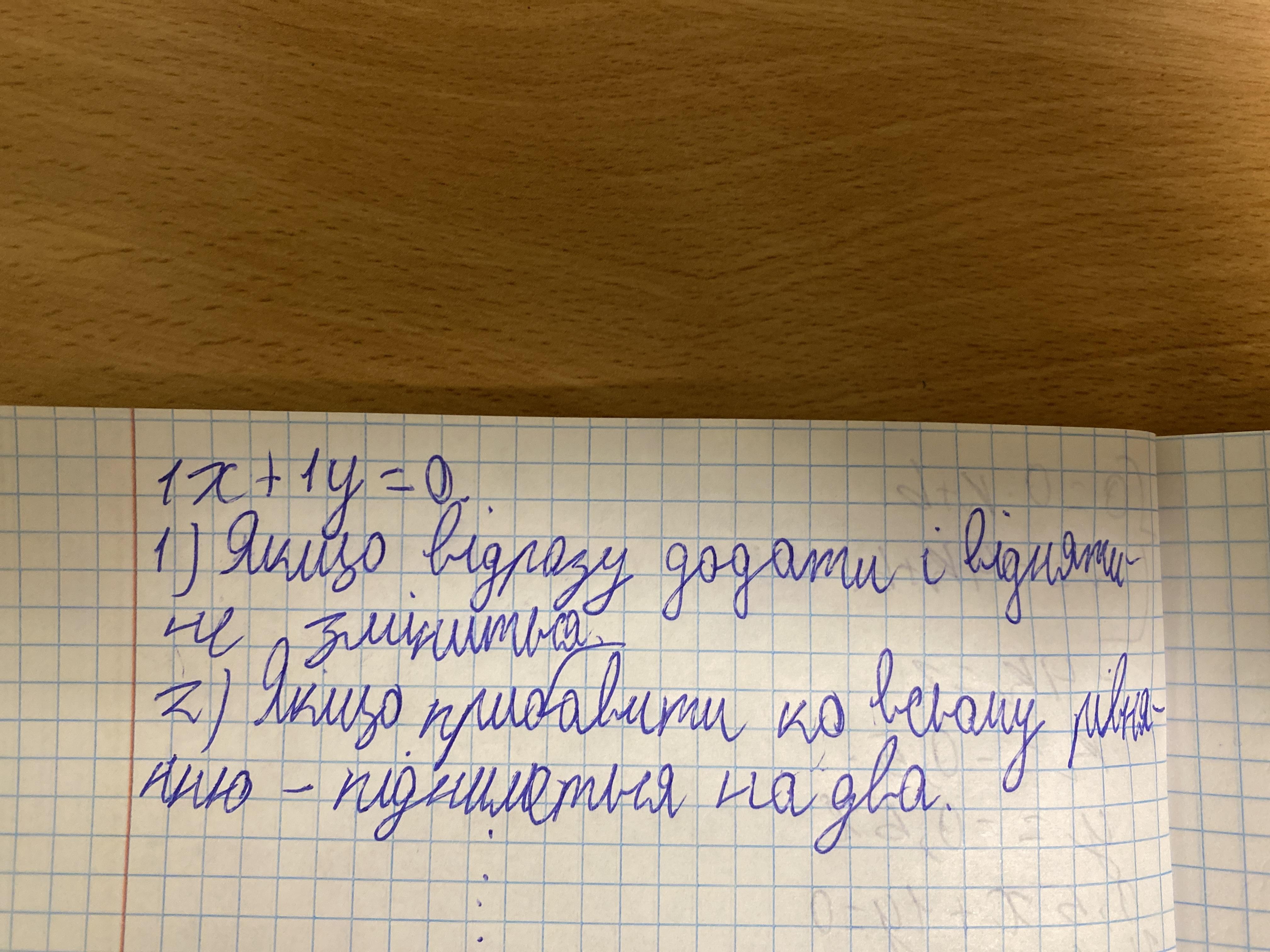 1. Складіть два лінійних рівняння з двома змінними зі своїми умовами (як у прикладах 979 і 980 у підручнику). У кожному виразіть x через y та y через x. Знайдіть які-небудь чотири розв`язки для обох рівнянь.