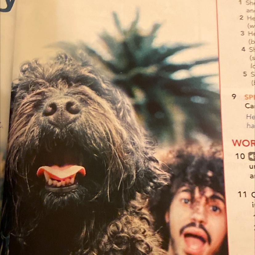 На этой картинке мы видим человека и собаку. Возможно это его собака и его лучший друг. Сперва опишем человека. Это кудрявый с темными волосами и не большими усиками человек, который стоит с открытым ртом смотря в камеру. У него карие глаза и выразительные черные брови. сразу же в глаза нам бросается огромная собака ,которая закрывает собой человека .Она волохатая, темношёрстая ,с шерстью, что закрывает ей даже глаза ,и тоже с открытым ртом ,как и хозяин .У неё розовый язык и чёрный нос.И наконец на заднем плане мы видим большое дерево, скорее всего это пальма . Стоя сзади собаки и человека ,она наводит нас на мысль, что эти двое на острове.