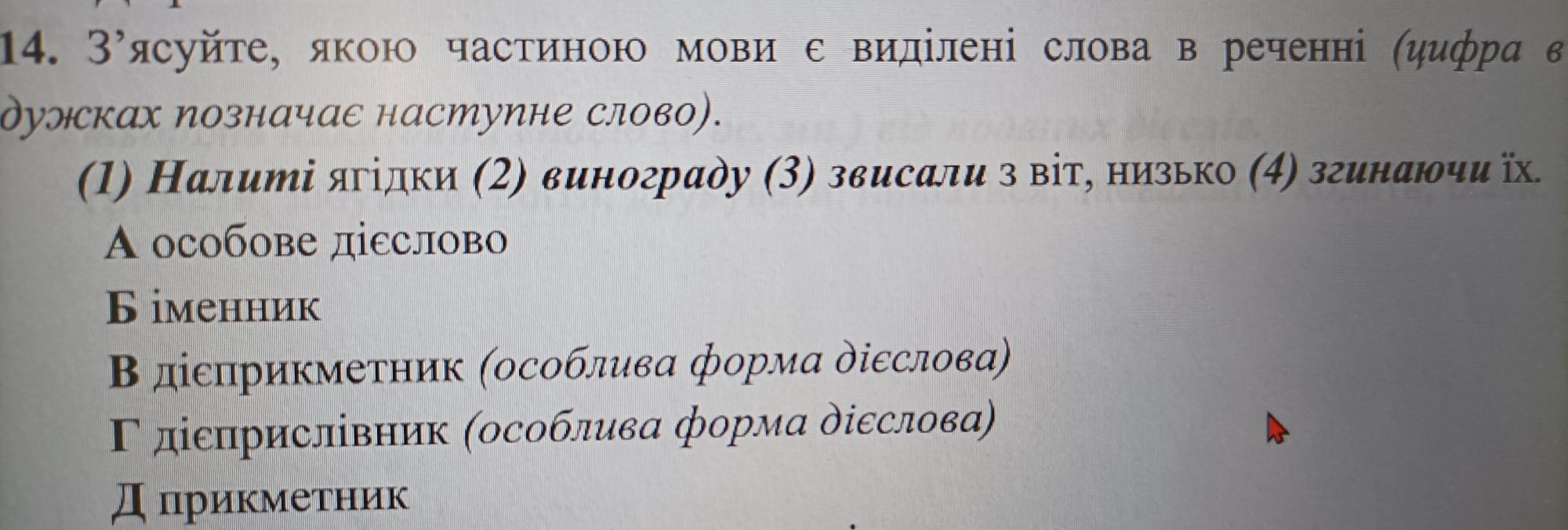 Г - дієприслівник (звисали). Він вказує на дію та обставину, в якій вона відбулася. А - іменник (ягідки). Б - особове дієслово (згинаючи). В - дієприкметник (винограду). Він вказує на ознаку певного предмета (винограду).