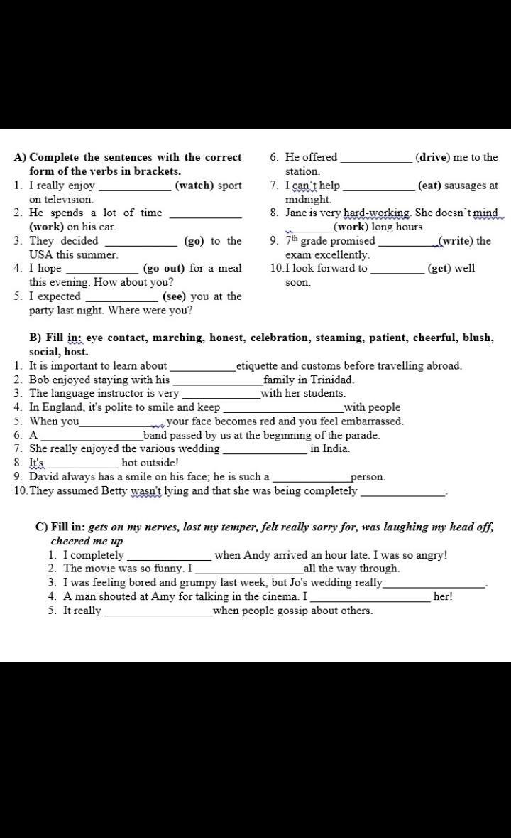 8. Working 9. To write 10. To get. B) 1. Social. 2. Host 3. Patient. 4. Eye contact 5. Blush 6. Marching 7. Celebration 8. Steaming 9. Cheerful 10. Honest C) 1. Lost my temper 2. Was laughing my head off 3. Cheered me up 4. Felt really sorry for 5. Gets on my nerves