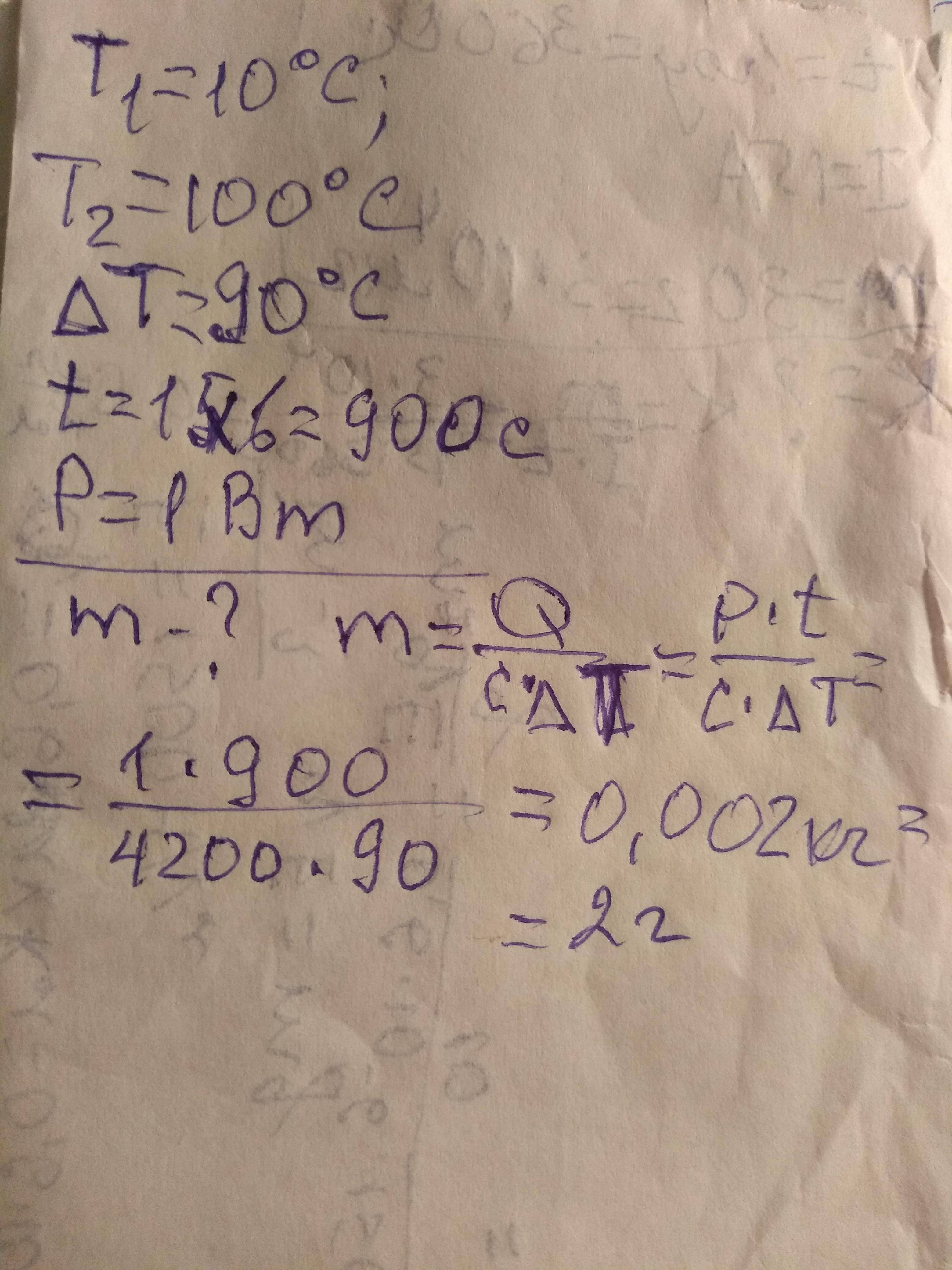 яка маса води нагріється від 10°С до 100°С, якщо кип'ятильник буде працювати 15 хв, потужністю 1Вт.