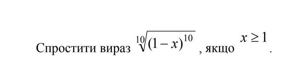 Ответ: |1-x|. Из числа 10 степени извлекли корень 10 степени... Всё. Раскрываем с модулем, потому что условие говорит, что выражение под корнем отрицательное или ноль