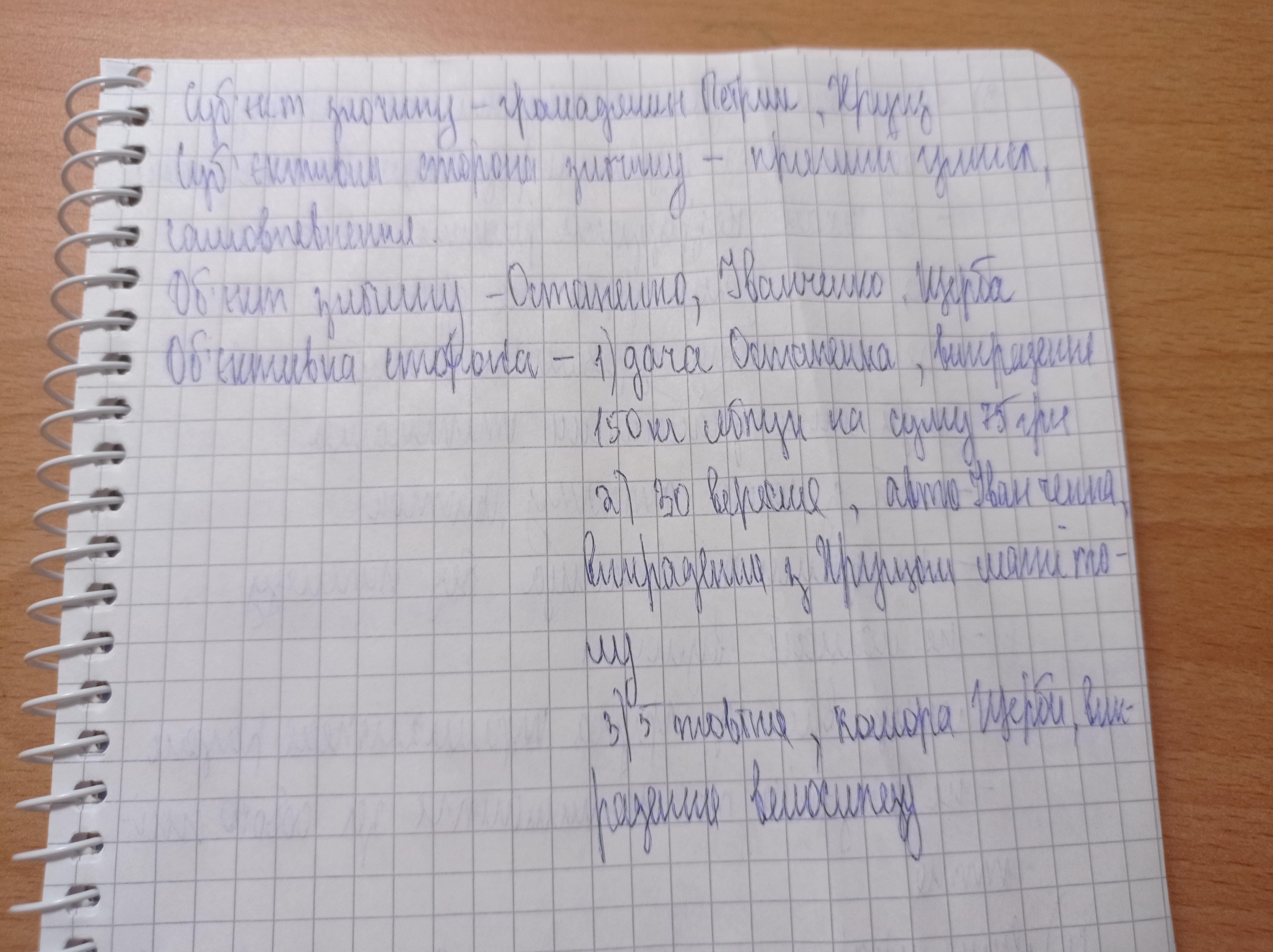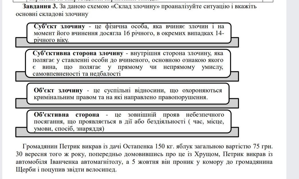 Громадянин Петрик викрав із дачі Остапенка 150 кг. яблук загальною вартістю 75 грн. 30 вересня того ж року, попередньо домовившись про це із Хрущом, Петрик викрав із автомобіля Іванченка автомагнітолу, а 5 жовтня він проник у комору до громадянина Щерби і поцупив звідти велосипед.