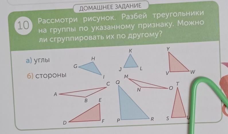 Рассмотри рисунок. Разбей треугольники на группы по указанному признаку. Можно ли сгруппировать их по другому? а) углы 6) стороны A D G в н E F P J M к L R S T W Г