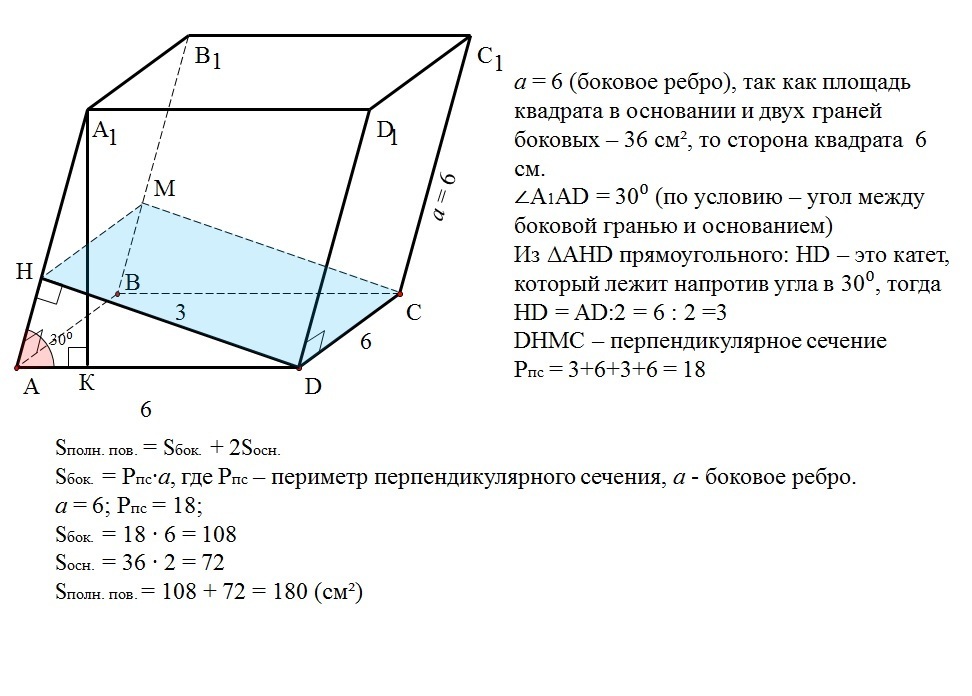 Взываю к помощиии))) в наклонном параллелепипеде основанием и одна из боковых граней - квадраты, плоскости которых образуют угол в 30 градусов, а площадь каждого их них равна 36 см2.найти площадь полной поверхности параллелепипеле.