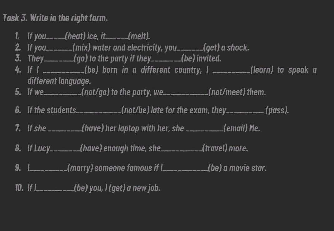 Task 3. Write in the right form. 1. If you______(heat) ice, it_______(melt). 2. If you 3. They- 4. If I (mix) water and electricity, you____ ___(get) a shock. _(go) to the party if they_____ (be) invited. _(be) born in a different country, I different language. 5. If we 6. If the students__________ 7. If she_ ___(not/go) to the party, we (not/be) late for the exam, they.. (have) her laptop with her, she 8. If Lucy___________(have) enough time, she__________ 9. I _____(marry) someone famous if __ 10. If I----- _(be) you, I (get) a new job. ____(learn) to speak a _____(not/meet) them. ___(email) Me. .(pass). (travel) more. (be) a movie star.