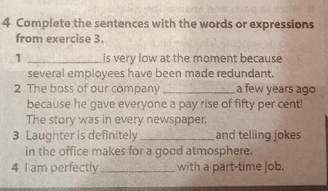 4 Complete the sentences with the words or expressions from exercise 3. 1 is very low at the moment because several employees have been made redundant. 2 The boss of our company because he gave everyone a pay rise of fifty per cent! The story was in every newspaper. 3 Laughter is definitely in the office makes for a good atmosphere. 4 I am perfectly a few years ago and telling jokes with a part-time job.