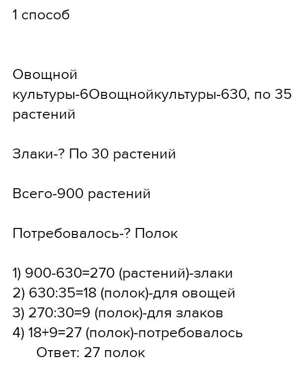 9 «космическим усло- сельским хозяйством». Учёные стали изучать влияние 900 растений, причём 630 из них были овощными культура- вий космоса на растения. В специальной теплице посадили злаки. Овощные рассадили по 35 штук на по 30 штук. Сколько полок потребо- ми, а остальные каждую полку, а злаки валось? ДОМАШНЕЕ ЗАДАНИЕ Реши задачу разными способами. Космическое агентство sake - - решило заняться ПОДЕЛИСЬ ПРЕДЛОЖИ ПРИДУМА пж помогите даю 100 балов