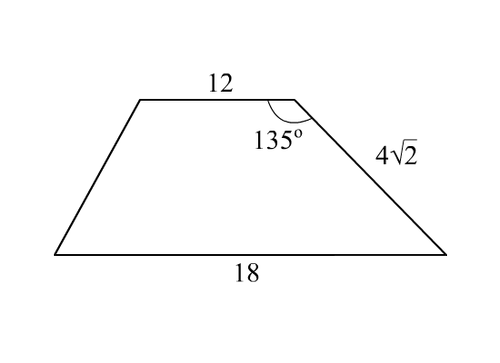 Основания трапеции равны 18 и 12, одна из боковых сторон равна 4 квадратных корня из двух, а угол между ней и одним из оснований равен 135°. Найдите площадь трапеции.