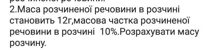 2.Маса розчиненої речовини в розчині становить 12г,масова частка розчиненої в розчині 10%.Розрахувати масу речовини розчину.