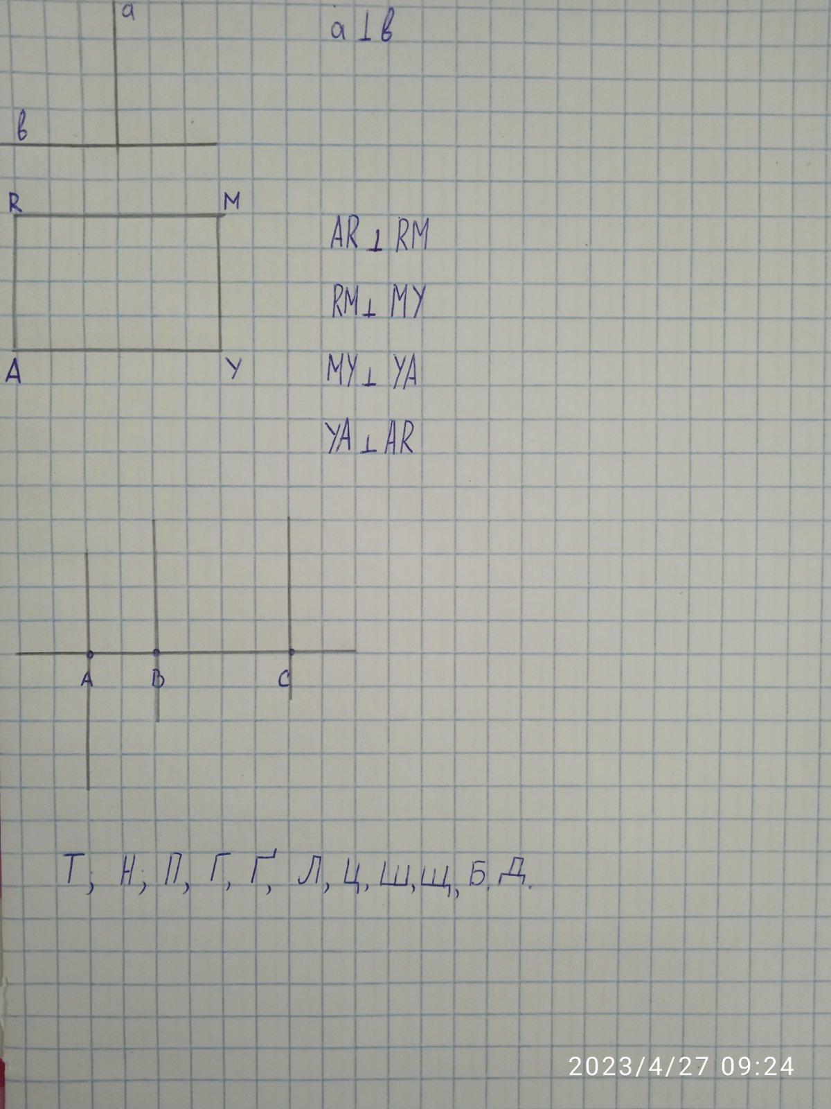 Наведіть кілька прикладів букв, що містять перпендикулярні відрізки (наприклад: Т, Н, П)