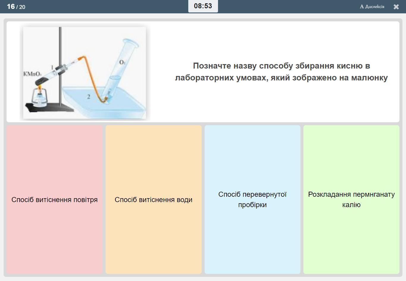 Позначте назву способу збирання кисню в лабораторних умовах, який зображено на малюнку