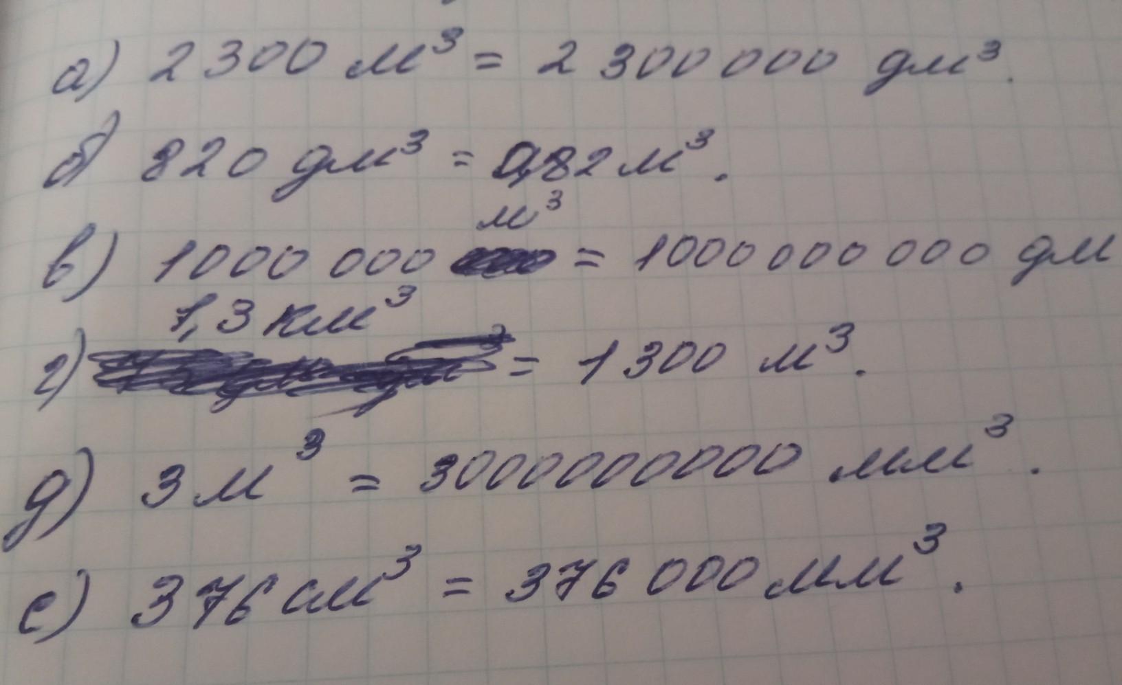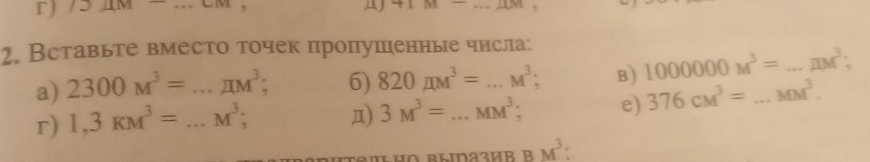 75 дм = ... см'; д) 41 м ставьте вместо точек пропущенные а) 2300 м² = ... дм3; -) 1.3 км M м'; б) 820 дм³ д) 3 м3 - S *** ДМ числа: м3; MM³: в) 1000000 м³ - ... да e) 376 см3 MM