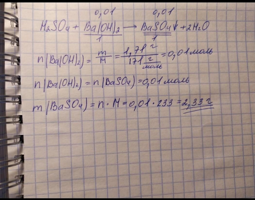 Яка маса барій сульфату утвориться під час взаємодії барій гідроксиду масою 1,71г з сульфатною кислотою?