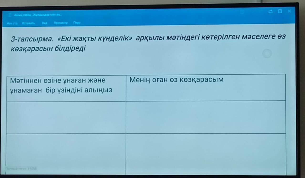 3-тапсырма. «Екі жақты күнделік» арқылы мәтіндегі көтерілген мәселеге өз көзқарасын білдіреді Мәтіннен өзіне ұнаған және ұнамаған бір үзіндіні алыныз Менің оған өз көзқарасым