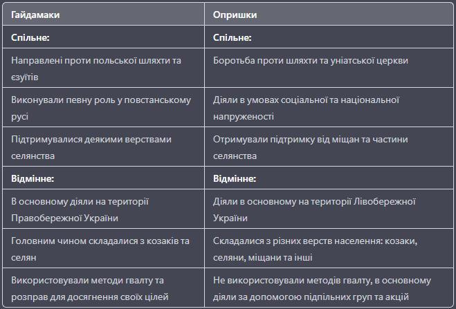 Діаграма порівняння боротьби гайдамаків та опришків: