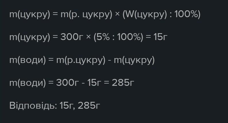 Отже, для приготування 300 г розчину з масовою часткою цукру 5% потрібно взяти 15 г цукру та 285 г води.