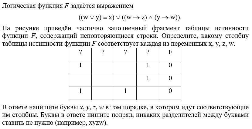 Логическая функция F задаётся выражением ((w \ y) = x) V ((w→ z) ^ (y→w)). На рисунке приведён частично заполненный фрагмент таблицы истинности функции F, содержащий неповторяющиеся строки. Определите, какому столбцу таблицы истинности функции F соответствует каждая из переменных x, y, Z, W. ? ? ? F 1 0 0 0 1 ? 1 1 1 В ответе напишите буквы x, y, z, w в том порядке, в котором идут соответствующие им столбцы. Буквы в ответе пишите подряд, никаких разделителей между буквами ставить не нужно (например, xyzw).