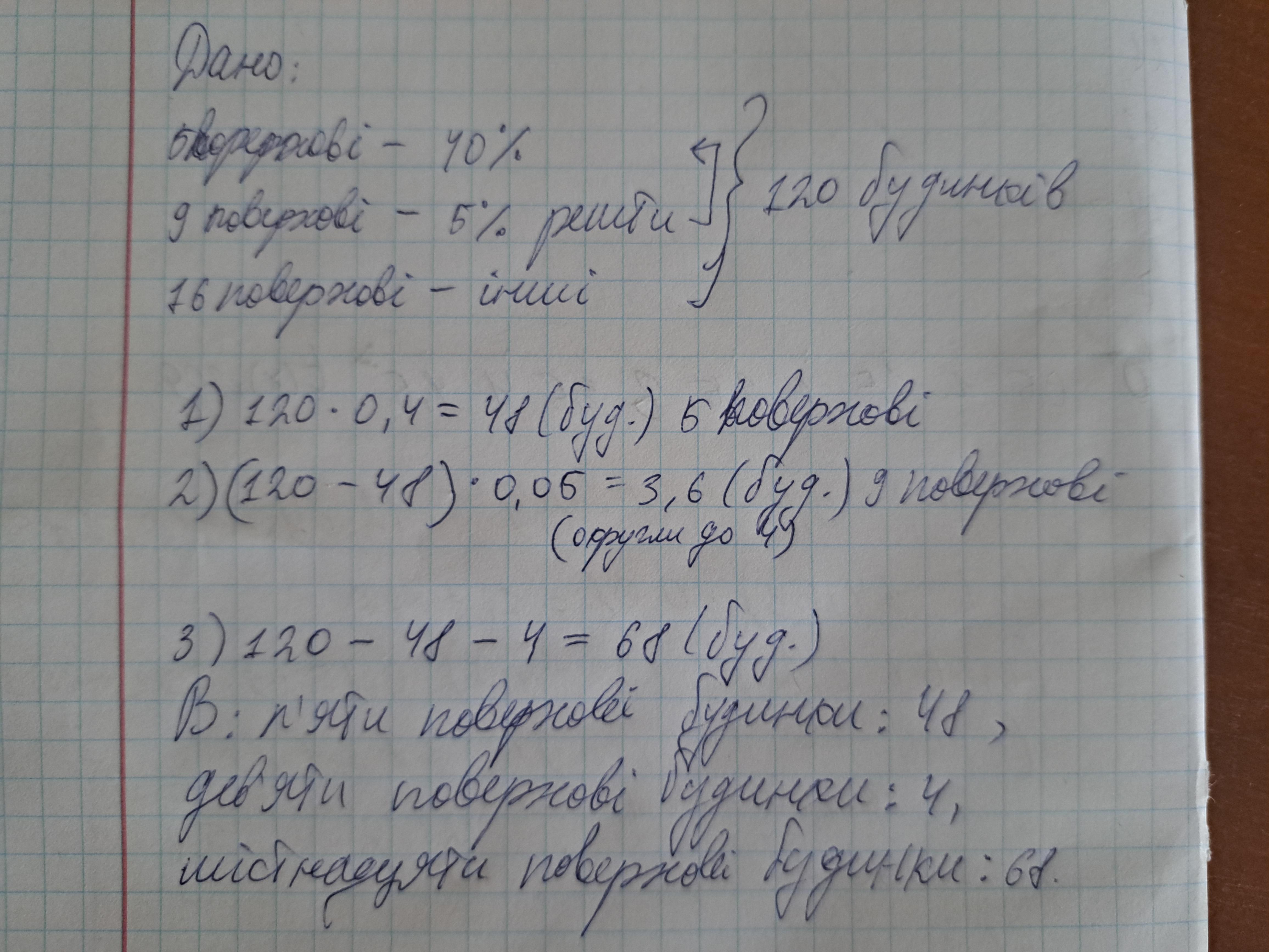4. У новому мікрорайоні всього 120 будинків. 40% усіх будинків-5-поверхові, 5% решти - 9-поверхові, інші - 16-поверхові. Скільки 16-поверхових будинків у мікрорайоні? (дії +пояснення відповідь)