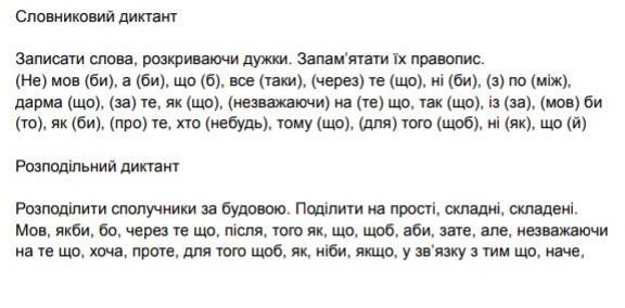 Словниковий диктант Записати слова, розкриваючи дужки. Запам’ятати їх правопис. (Не) мов (би), а (би), що (б), все (таки), (через) те (що), ні (би), (з) по (між), дарма (що), (за) те, як (що), (незважаючи) на (те) що, так (що), із (за), (мов) би (то), як (би), (про) те, хто (небудь), тому (що), (для) того (щоб), ні (як), що (й) Розподільний диктант Розподілити сполучники за будовою. Поділити на прості, складні, складені. Мов, якби, бо, через те що, після, того як, що, щоб, аби, зате, але, незважаючи на те що, хоча, проте, для того щоб, як, ніби, якщо, у зв’язку з тим що, наче (помогите пожалуйста)