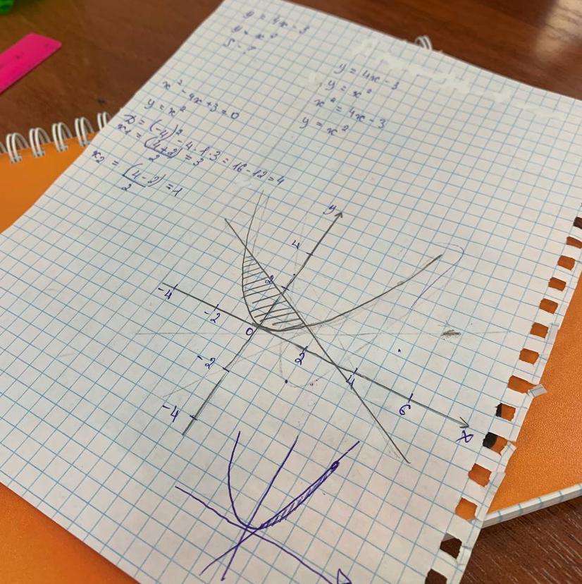 Тогда S=∫₁³f₁(x)dx - ∫₁³f₂(x)dx = ∫₁³(4x-3)dx - ∫₁³(x²)dx;