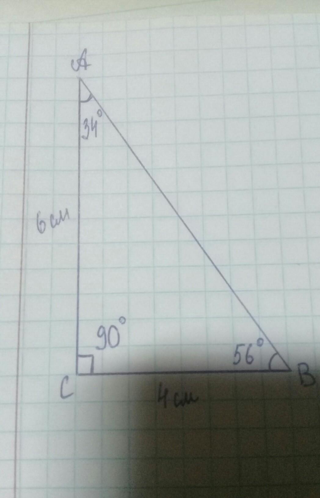На заметочку, сумма градусов углов треугольника равна 180° (у нас так и получилось 90+56+34=180)