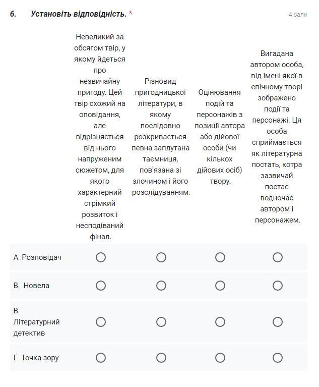 1 новела, 2 літературний детектив, 3 точка зору, 4 розповідач