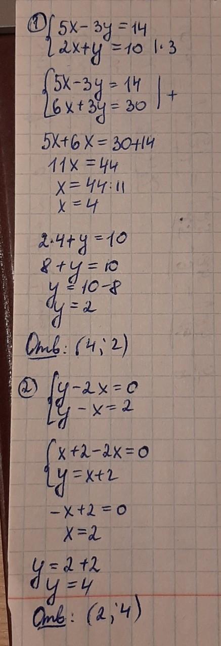 1.Решить систему уравнений Вариант I 5x-3y=14, 2x+y=10; 2. Решить систему уравнений методом подстановки: {y - 2x = 0, { y-x = 2. 3. Решить систему уравнений: 4(x-y) = -2, 3x+2y = 5-2(x+y);