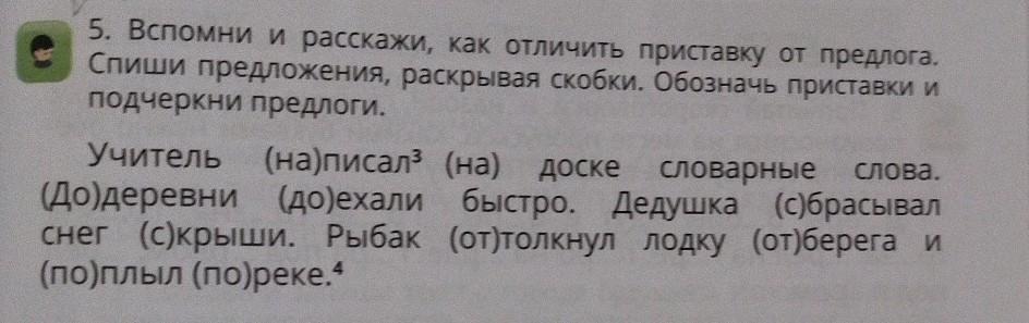 5. Вспомни и расскажи, как отличить приставку от предлога. Спиши предложения, раскрывая скобки. Обозначь приставки и подчеркни предлоги. Учитель (на)писал3 (на) доске словарные слова. (до)деревни (до)ехали быстро. Дедушка (с)брасывал снег (с)крыши. Рыбак (от)толкнул лодку (от)берега и (по)плыл (по)реке.