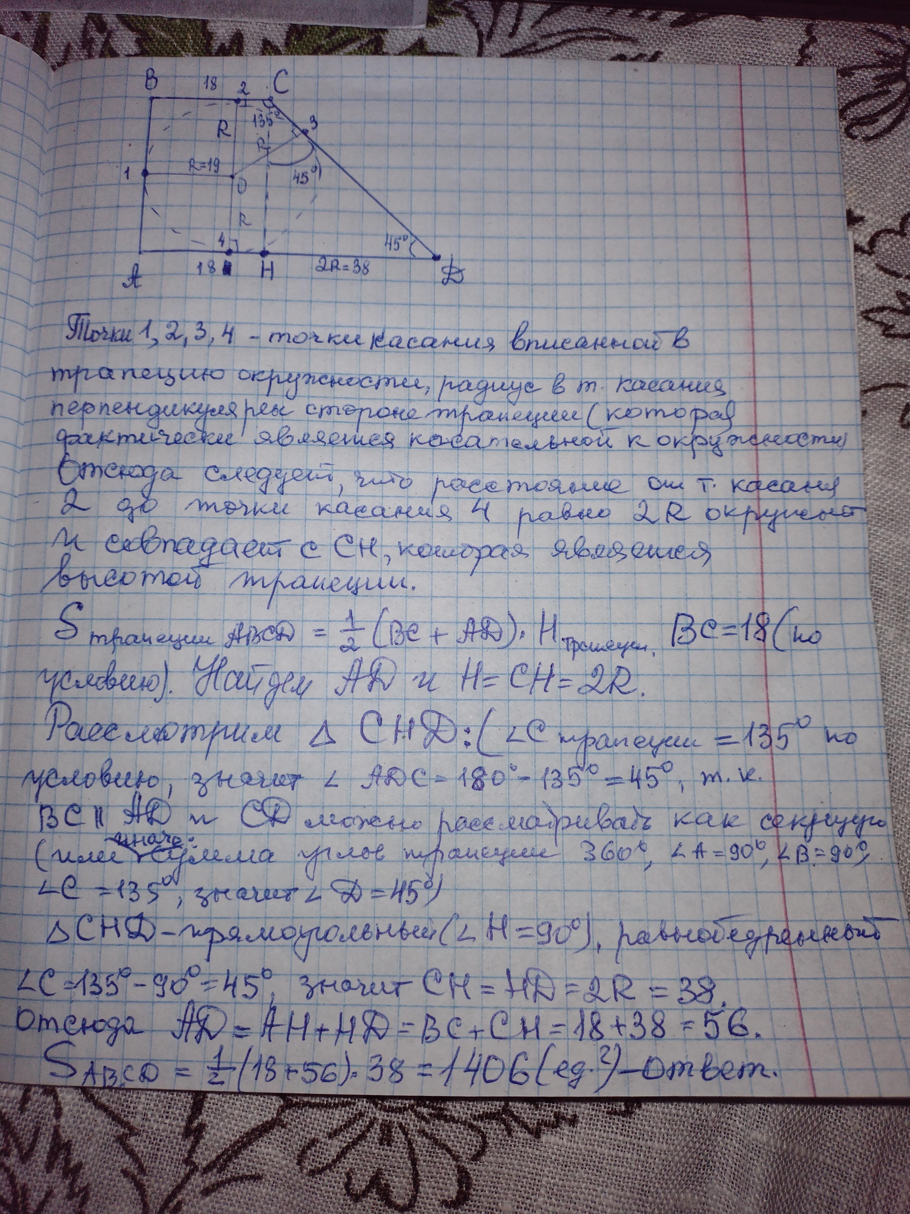 В прямоугольную трапецию вписана окружность с радиусом равным 19. Найди площадь данной трапеции, если её меньшее основание равно 18, а один из углов равен 135°.