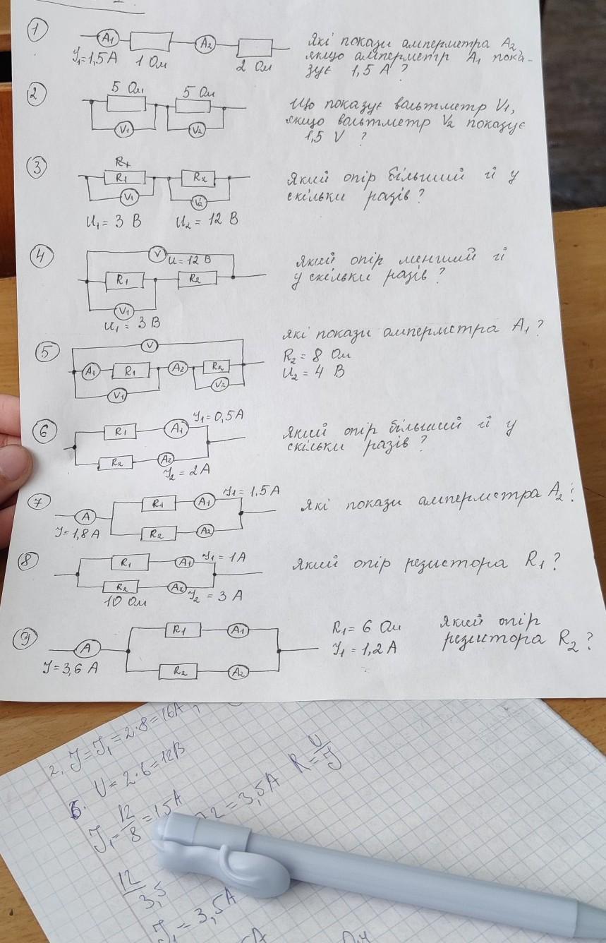 6. U₁=U₂; R₁=U/I₁; R₂/R₁=I₁/I₂=0,5/2=0,25; R₁ більше в 4 рази;