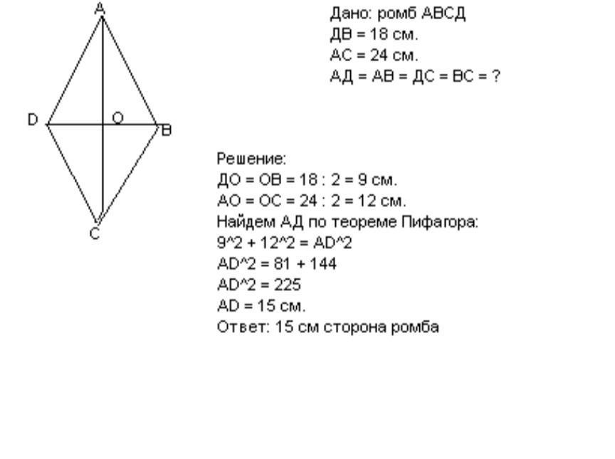 диагонали ромба перпендикулярны и в точке пересечения делятся пополам.