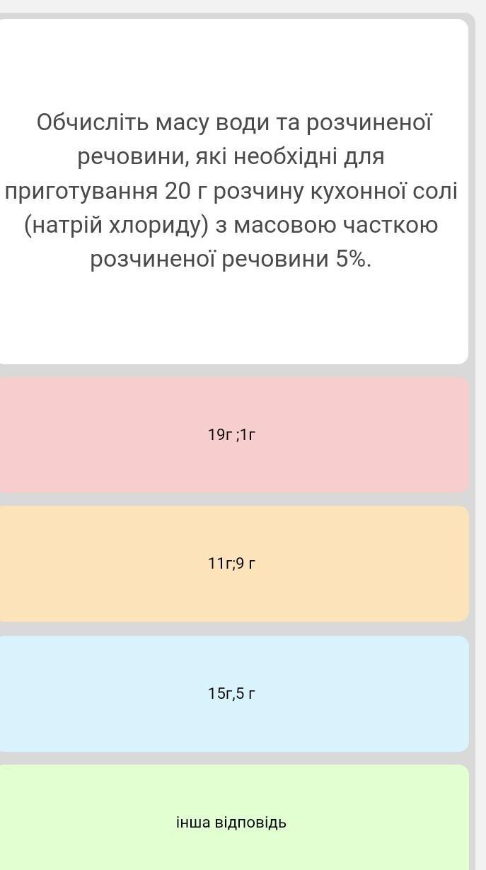 Обчисліть масу води та розчиненої речовини, які необхідні для приготування 20 г розчину кухонної солі (натрій хлориду) з масовою часткою розчиненої речовини 5%.