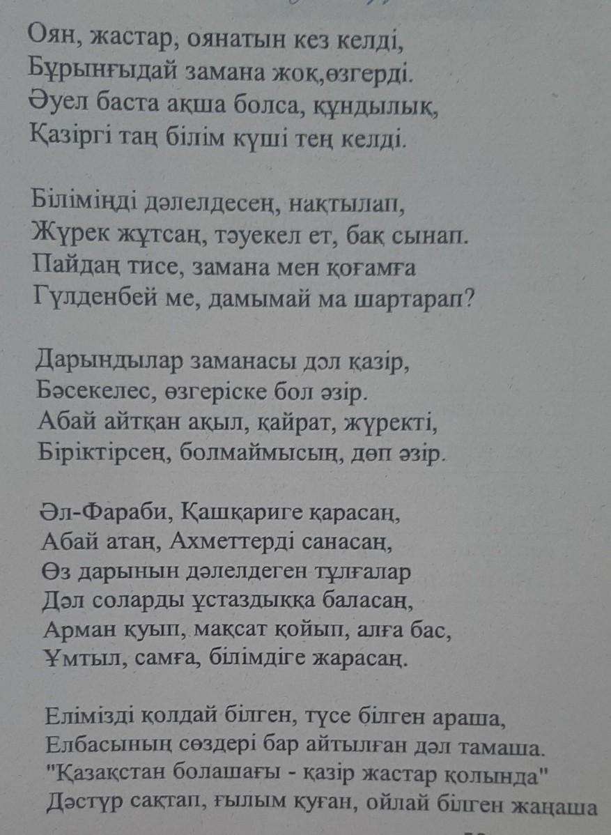 Идея: Мұнда өлеңнің жарығы туралы хабарлау туралы болады. Бұл тақырыпта өлеңнің маңыздылықтарын, оның өмірдің барлық жағдайларын әсерлейтін кездерді және оның өмірдегі рөлін талдауға болады. Осы тақырыпта өлеңнің жарығына байланысты адамдардың менталды денсаулықты ұзарту, жоғары деңгейде болу және өмірдегі маңыздылықтарды тану мақсаттарымен хабарлау жасалады.