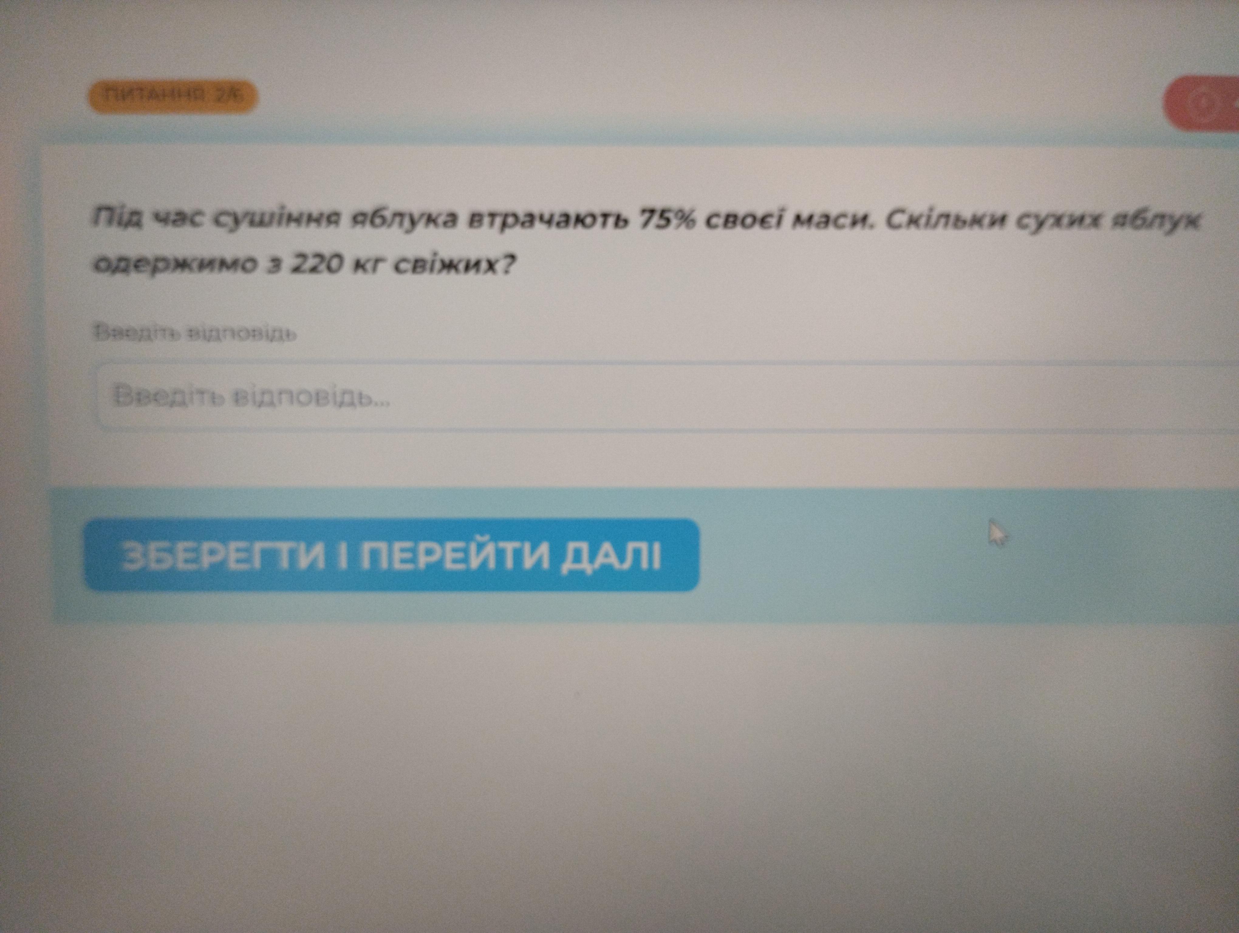 Під час сушіння яблука втрачають 75 відсотків своєї маси. Скільки сухих яблук одержуємо з 220 кг свіжих?