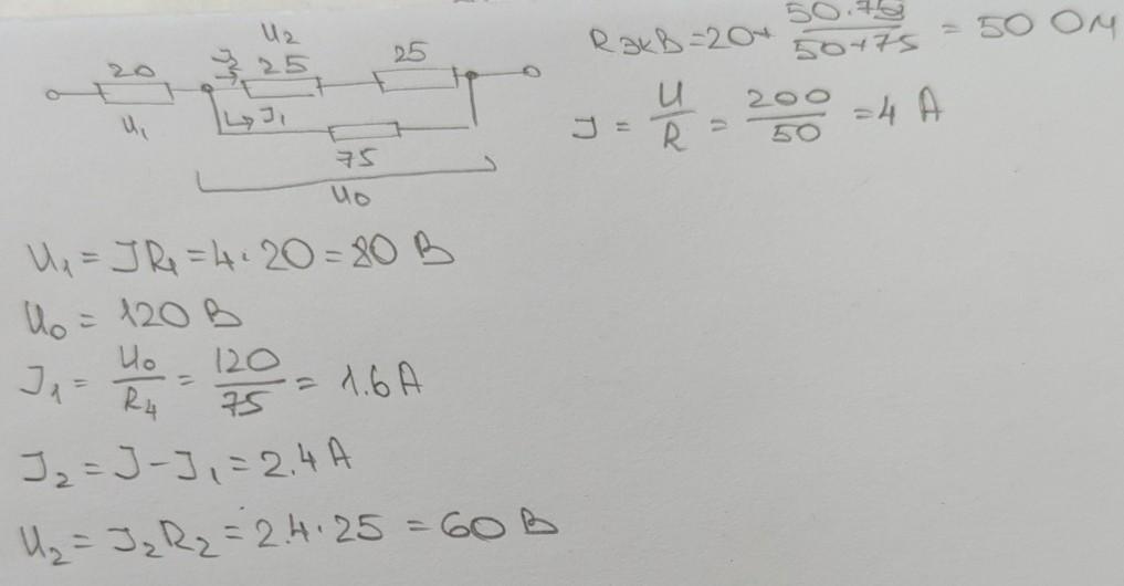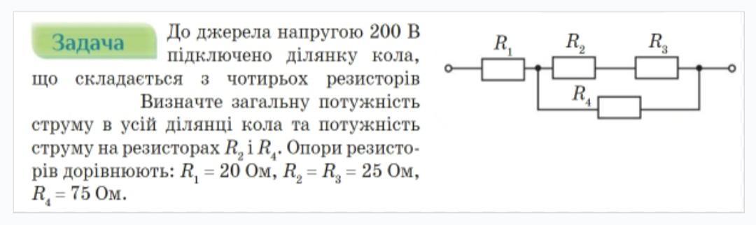 До джерела напругою 200В підключено ділянку кола що складається з чотирьох резисторів Визначте загальну потужність струму в усій ділянці кола та потужність струму на резісторах R2 і R4. Опори резисторів дорівнюють R1= 20 Ом, R2=R3=25 Ом, R4=75 Ом