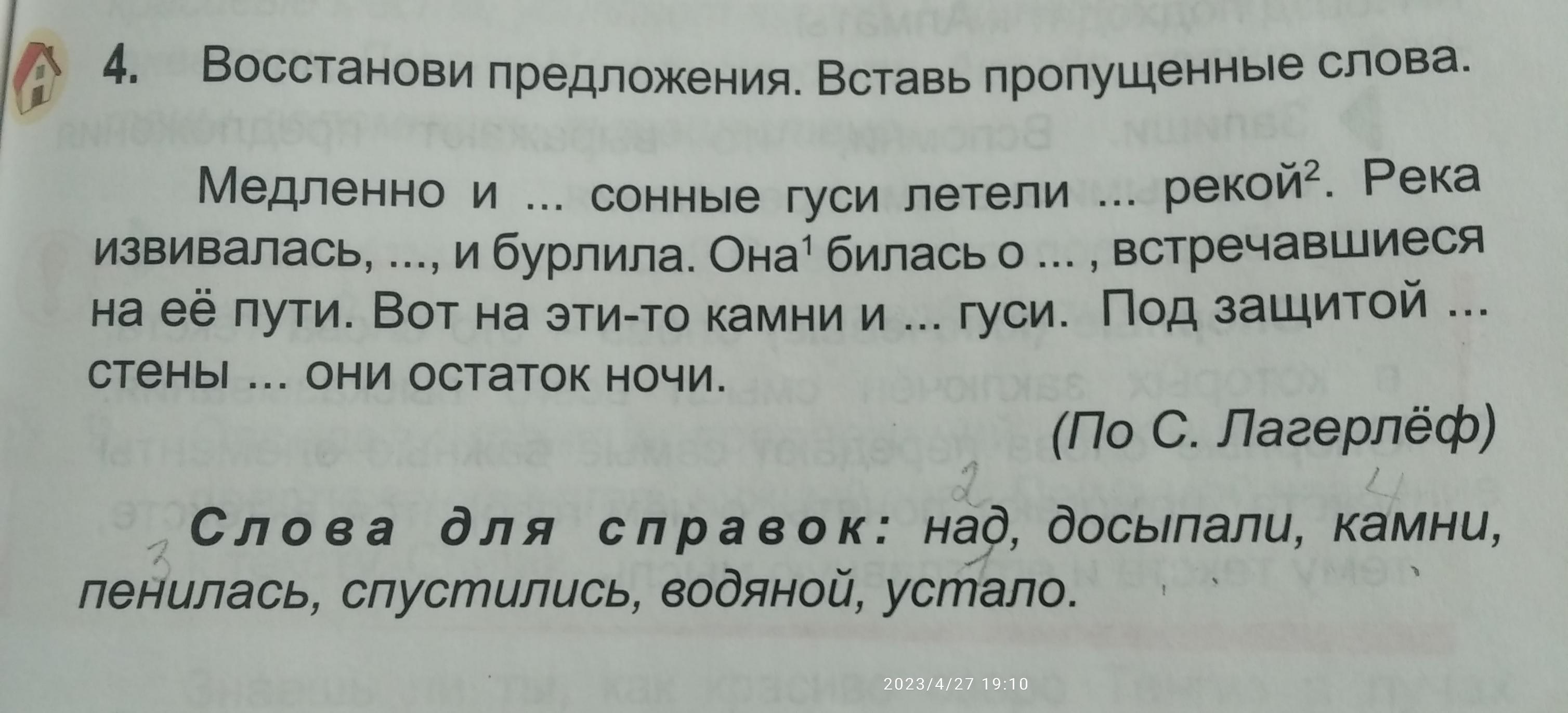 Медленно и устало сонные гуси летели над рекой.Река извивалась,пенилась,и бурлила.Она билась о камни,встречавшиеся на её пути.Вот на эти-то камни и спустились гуси.Под защитой водяной стены досыпали они остаток ночи.