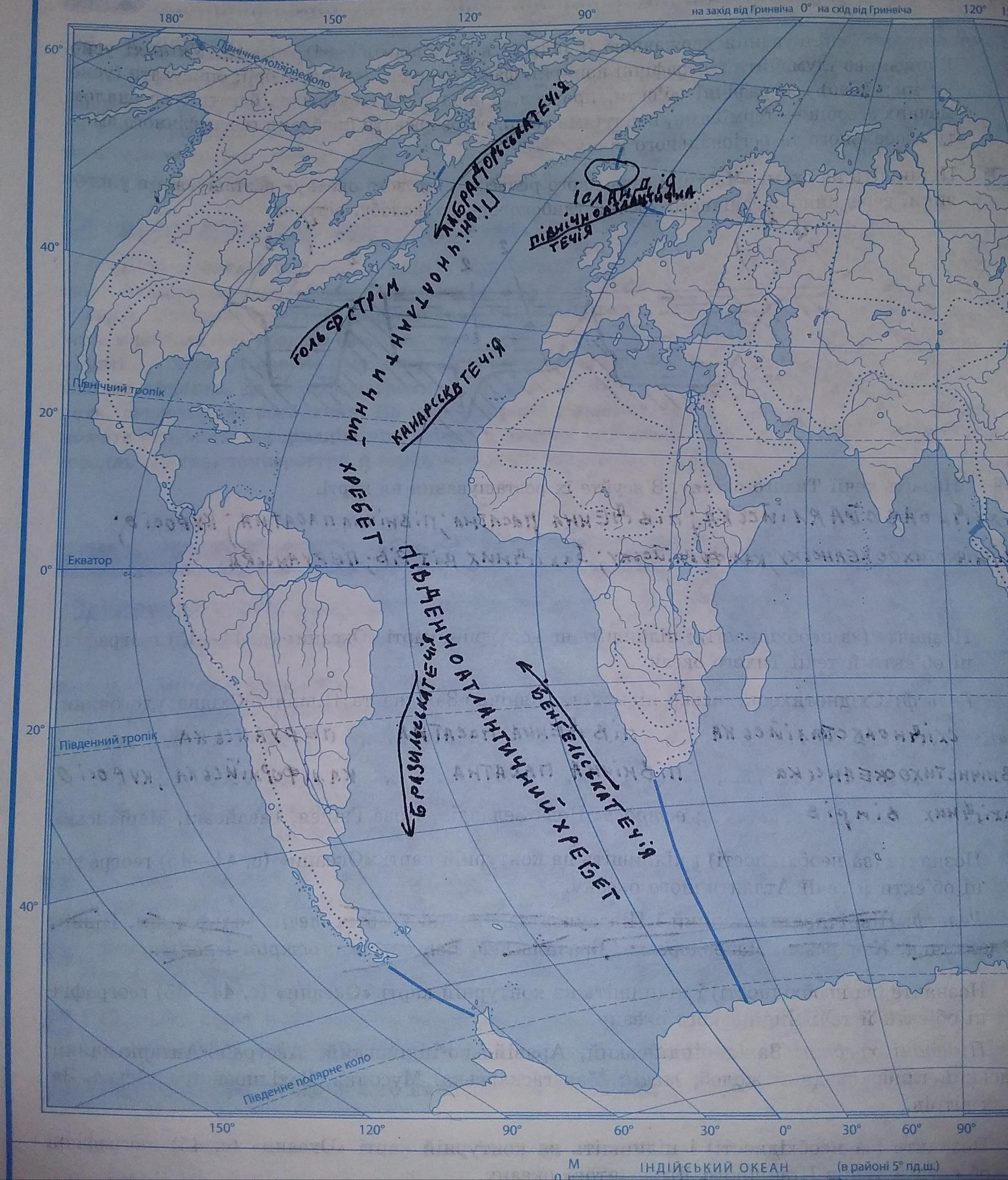 Позначте (за необхідності) і підпишіть на контурній карті «Океани» (с. 44-45) географіч- ні об'єкти й течії Атлантичного океану. Рельєф: Північноатлантичний і Південноатлантичний хребти; течії: Гольфстрим, Північ- ноатлантична, Канарська, Лабрадорська, Бразильська, Бенгельська; острів: Ісландія.