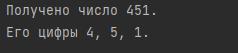print(f'Его цифры {first_digit}, {second_digit}, {third_digit}.')