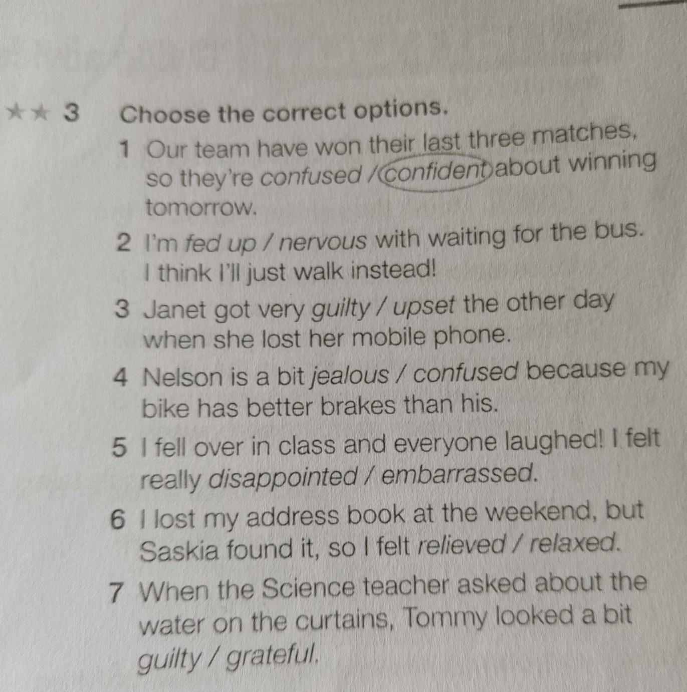 ★★ 3 Choose the correct options. 1 Our team have won their last three matches, so they're confused/confident about winning tomorrow. 2 I'm fed up / nervous with waiting for the bus. I think I'll just walk instead! 3 Janet got very guilty/ upset the other day when she lost her mobile phone. 4 Nelson is a bit jealous / confused because my bike has better brakes than his. 5 I fell over in class and everyone laughed! I felt really disappointed / embarrassed. 6 I lost my address book at the weekend, but Saskia found it, so I felt relieved / relaxed. 7 When the Science teacher asked about the water on the curtains, Tommy looked a bit guilty / grateful. there words