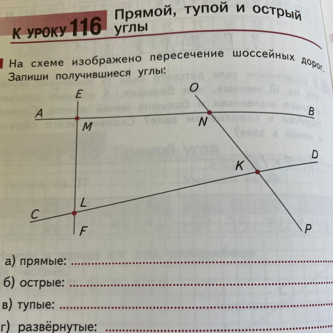 На схеме изображено пересечение шоссейных дорог. Запиши получившиеся углы. Нужно указать прямые, острые, тупые, развернутые.
