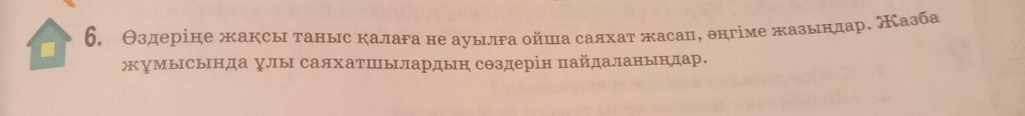 6. Өздеріне жаксы таныс калага не ауылға ойша саяхат жасап, әңгіме жазындар. Жазба жұмысында ұлы саяхатшылардың сөздерін пайдаланындар.