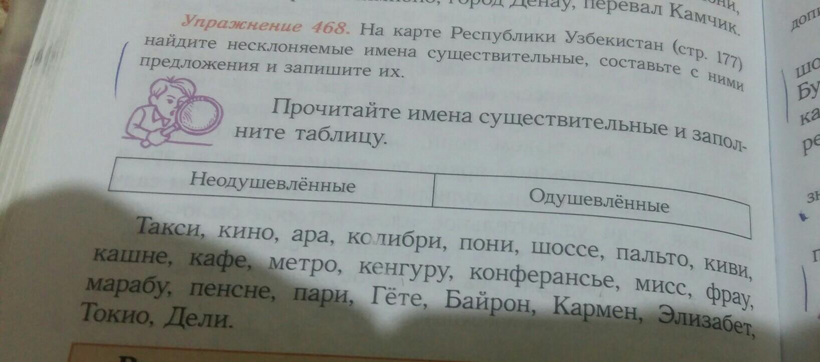 Одушевленные имена существительные (кто?): ара; колибри; пони; кенгуру; конферансье; мисс; фрау; марабу; Гёте; Байрон; Кармен; Элизабет