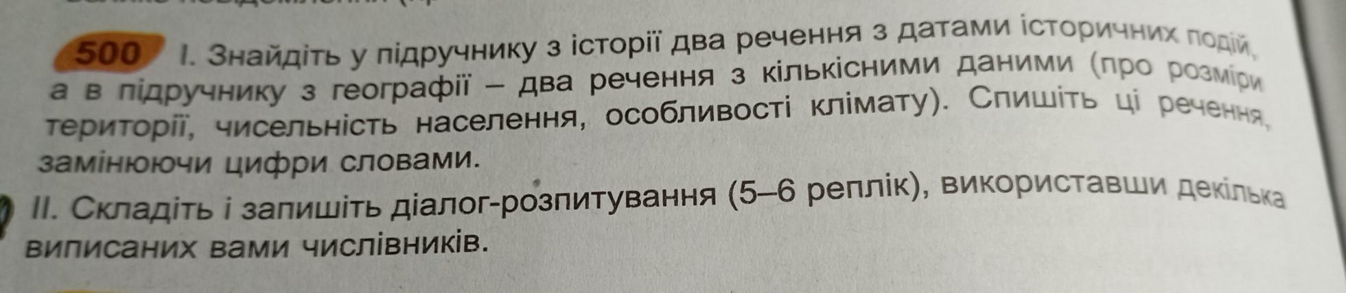 500 1. Знайдіть у підручнику з історії два речення з датами історичних подій, території, чисельність населення, особливості клімату). Спишіть ці речення, два речення з кількісними даними (про розміри а в підручнику з географії замінюючи цифри словами. II. Складіть і запишіть діалог-розпитування (5–6 реплік), використавши декілька виписаних вами числівників.