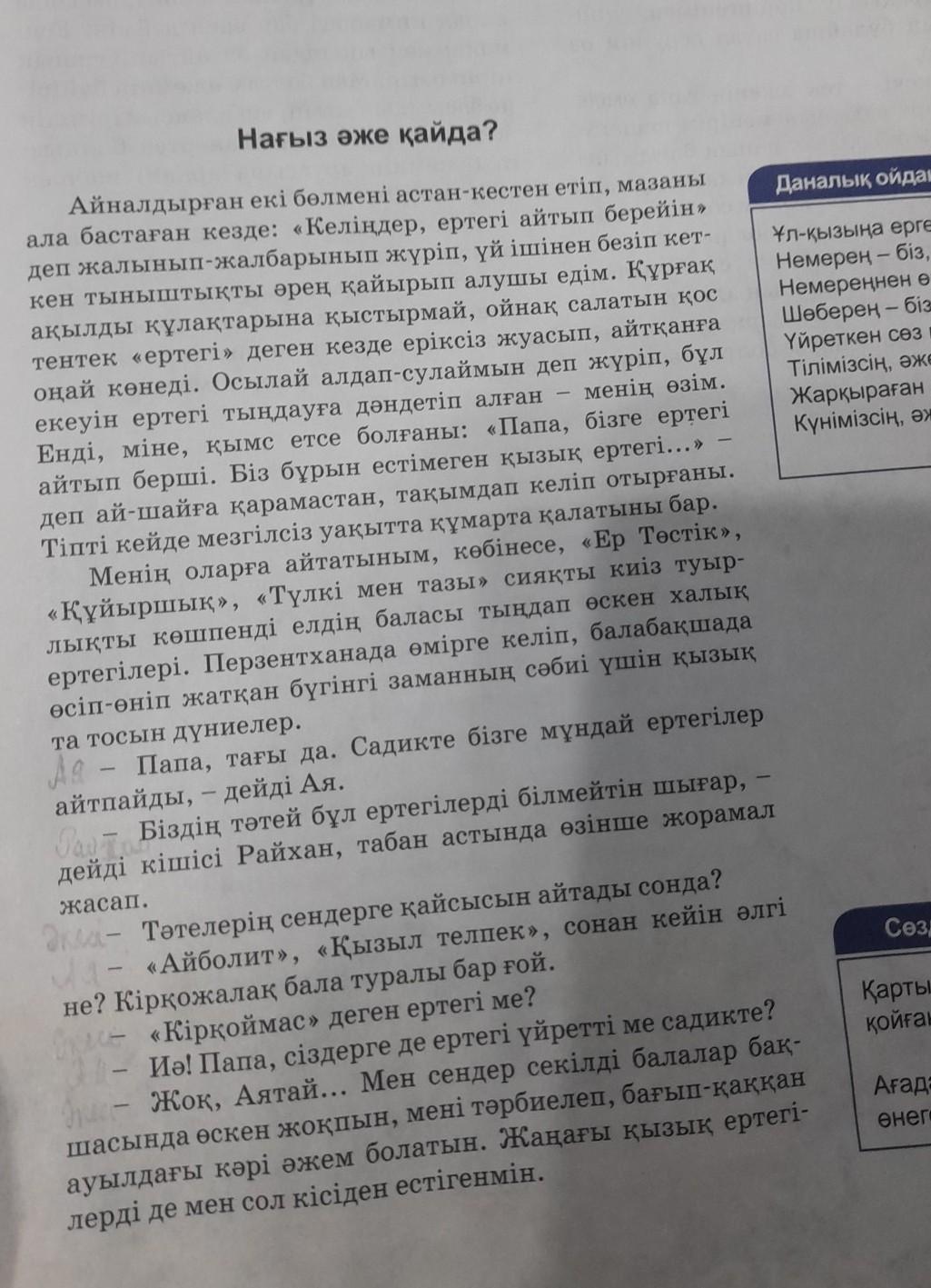 - Біздің әже саған ойыншық па саған?!-,деп Аяға ашуланады. Үйге келген соң Аясы сұрақ қояды: