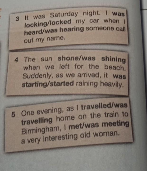 ne ве 3 It was Saturday night. I was locking/locked my car when I heard/was hearing someone call out my name. 4 The sun shone/was shining when we left for the beach. Suddenly, as we arrived, it was starting/started raining heavily. 5 One evening, as I travelled/was travelling home on the train to Birmingham, I met/was meeting a very interesting old woman.