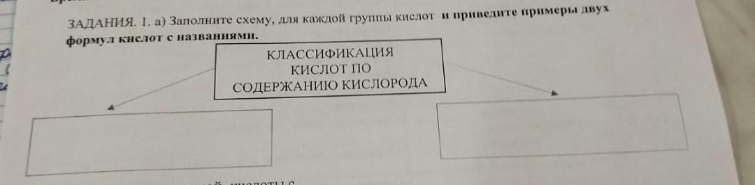 ЗАДАНИЯ. 1. а) заполните схему, для каждой группы кислот и приведите примеры двух формул кислот с названиями.