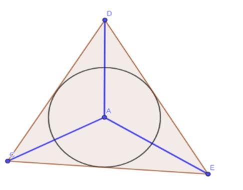 У трикутник CDE вписано коло з центром в точці A, ∠ACD=35°, а ∠E на 10° більше за ∠C.