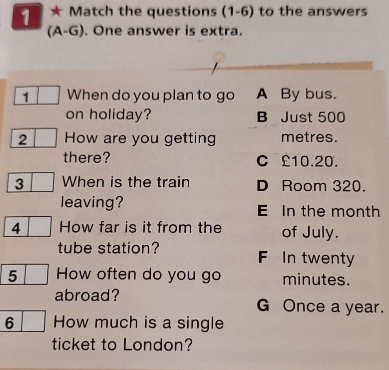 Match the questions (1-6) to the answers (A-G). One answer is extra.