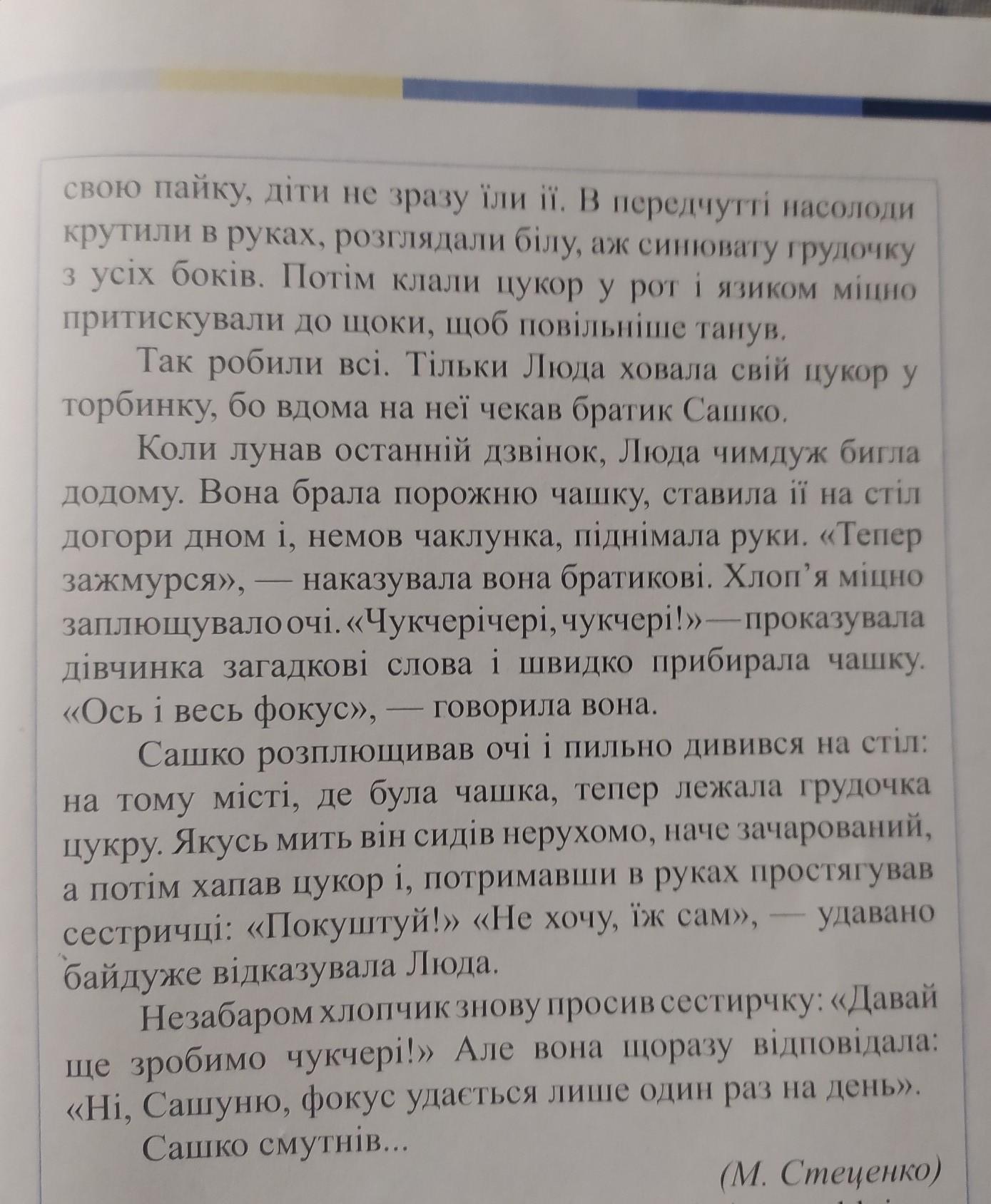 lipit, copiii nu l-au mâncat imediat. În așteptarea plăcerii, cablurile din mâinile lor priveau șuvițele albe, deja albăstrui din toate părțile. Apoi au pus zahăr în gură și au apăsat limba micuță spre obraz pentru a se topi mai încet. La fel și toată lumea. Doar Luda și-a ascuns zahărul în geantă, pentru că fratele ei Sasha o aștepta acasă. Când a sunat ultimul apel, Luda a fugit acasă. A luat o ceașcă goală, a pus-o pe masă cu capul în jos și, ca o vrăjitoare, a ridicat mâinile. "- Acum clemă, a poruncit fratele. Băiatul s-a încruntat bine. "Chukchericery, Chukcheri!"Fata a arătat cuvinte misterioase și a curățat rapid cupa. » Acesta este întregul truc ", a spus ea. Sasha deschise ochii și privi cu atenție la masă: pe orașul în care se afla cupa, acum era o grămadă de zahăr. O clipă s-a așezat nemișcat, ca și cum ar fi fermecat, apoi a apucat zahărul și, ținându-se în mâini, și-a ținut sora: « Notifica!""Nu vreau să mă mănânc ", a spus Luda clar indiferent. Curând băiatul a întrebat-o din nou pe sora cea mică: „Hai să facem din nou niște chucheri!”!"Dar de fiecare dată când a răspuns: « Nu, Sasha, accentul este doar o dată pe zi ». Sasha era jenată